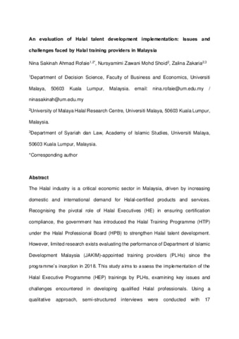 Nina Sakinah, Ahmad Rofaie and Nursyamimi Zawani, Mohd Shoid and Zalina, Zakaria (2025) An evaluation of halal talent development implementation: Issues and challenges faced by halal training providers in Malaysia. In: 2nd International Halal Ecosystem Conference, 8-9 Oktober 2025, Osaka, Jepun. (Submitted)